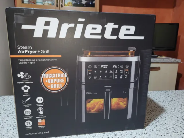 Dettagli del prodottoFriggitrice ad aria Ariete modello Steam AirFryer + Grill con funzione vapore e grill. Capienza cestello 7L.