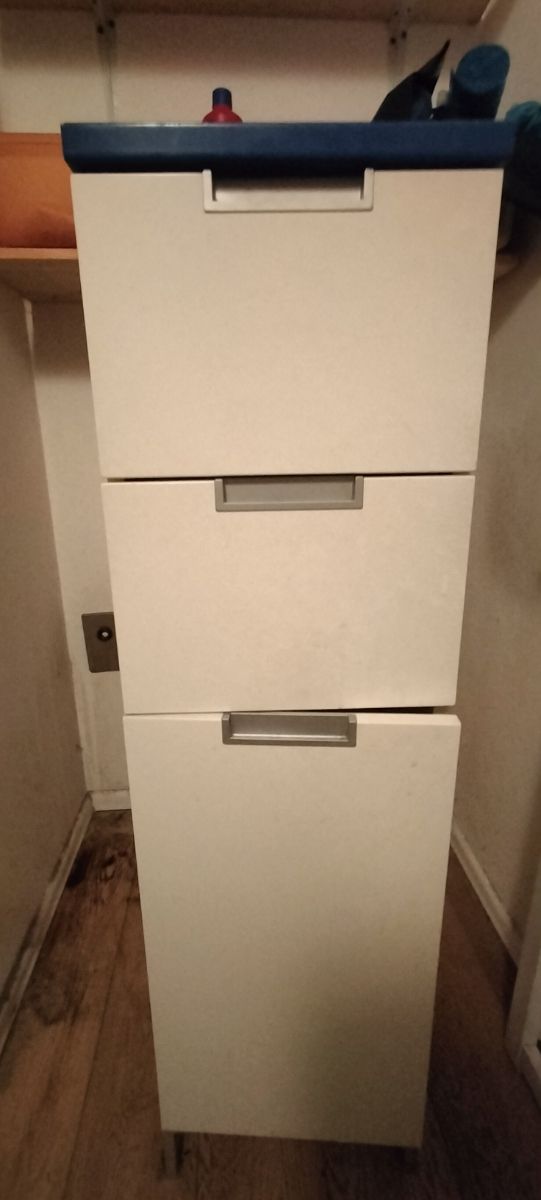 Dettagli del prodottoarmadietto bianco laccato con top blu composto da due cassetti e 1 anta con ripiano in vetro. usato, ben tenuto ma con qualche piccola imperfezione sul top Misure del prodotto