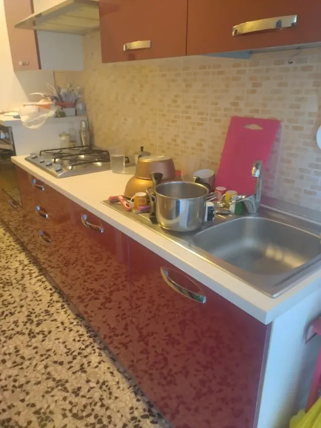 Arredo cucina completo con mobili e piano. - Mobili con ante color rosso. - Piano di lavoro bianco. - Lavello in acciaio inox. - Piano cottura a gas.