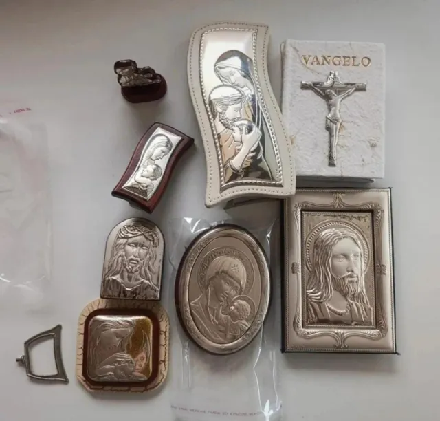 Dettagli del prodottoLotto di articoli religiosi in argento laminato, perfetti come bomboniere o decorazioni.