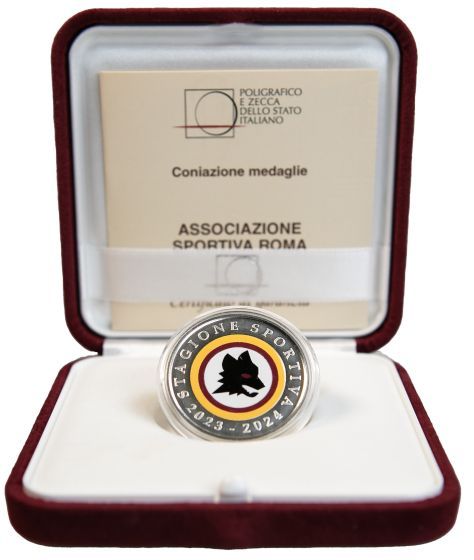 Dettagli del prodottoMedaglia ufficiale dell'AS Roma per la stagione sportiva 2023-2024, coniata dall'Istituto Poligrafico e Zecca dello Stato.