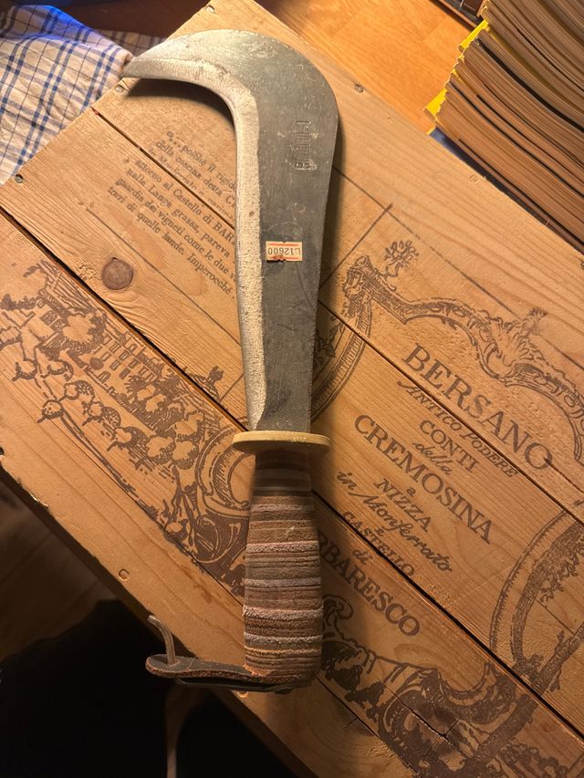 Attrezzo da taglio con lama curva e manico in cuoio. - Lama in metallo. - Manico a strati di cuoio. - Anello di aggancio in pelle.