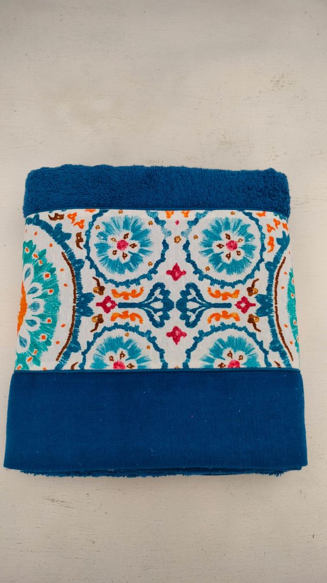 Asciugamani bagno blu con balza fantasia Asciugamani bagno viso + ospite blu Asciugamano viso 60×110 cm., Ospite 40×60 cm.