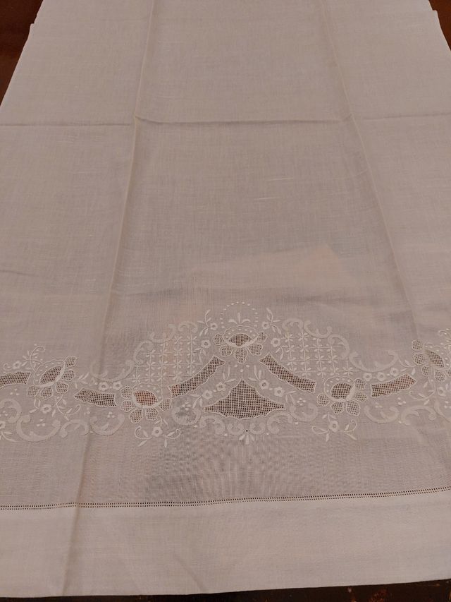 Dettagli del prodottoBellissimo asciugamano realizzato su tessuto di puro lino sfilato e ricami e orlo a giorno fatti interamente a mano misura 111x72 cm,non e stato mai usato privo di qualsiasi difetto ancora inamidato,