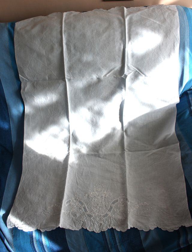 Con ricamo molto bello, probabilmente fatto a mano. Bordo ricamato anche sull'altro lato. Piccolissima macchia visibile in fotografia.