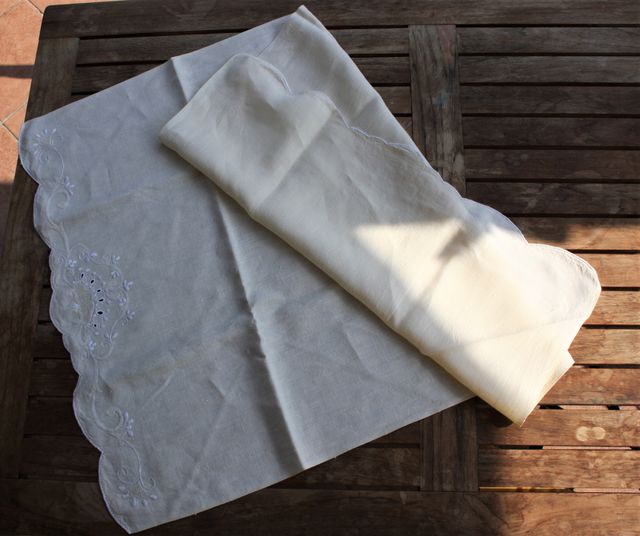 Ricamo in cotone su uno dei due lati, molto elaborato, e bordi a onde con orlo a giorno e bordino ricamati a mano.