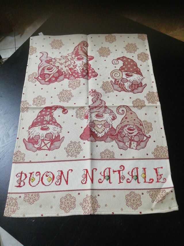 Asciugapiatti natalizio ricamato a mano a punto croce con tema buon Natale! In cotone, mai utilizzato.