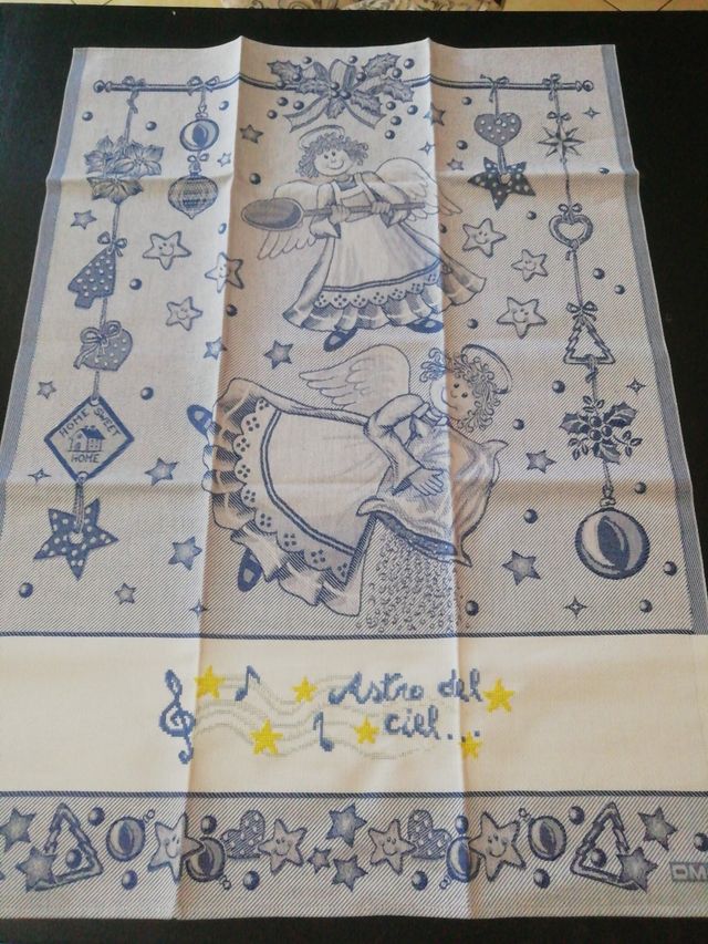 Asciugapiatti natalizio ricamato a mano a punto croce con tema musicale, marchio DMC, in cotone, mai utilizzato.