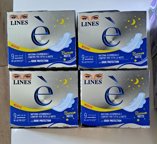 Dettagli del prodottoVendo, A MENO DI META' PREZZO, causa inutilizzo, 12 confezioni assorbenti Lines E' Notte. Ideali per la notte, offrono massima assorbenza e comfort. Con protezione dagli odori
