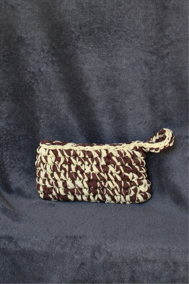 Astuccino realizzato a mano all'uncinetto con denim marrone e fettuccia di cotone giallo. - Zip cucita a mano