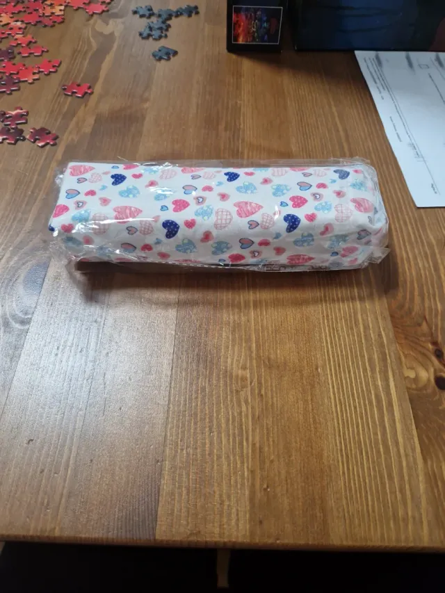 Astuccio con chiusura a cerniera, ideale per la scuola - Fantasia con cuoricini rosa, blu e bianchi. - Rivestimento esterno in tessuto. - Chiusura a zip.