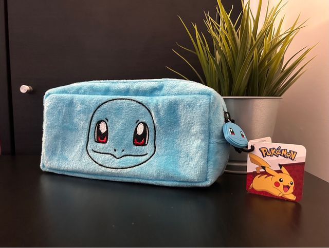 Astuccio morbido in peluche azzurro con il volto di Squirtle ricamato. - Design a tema Pokémon. - Chiusura con cerniera.