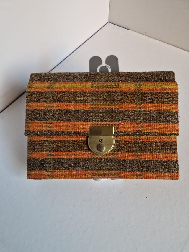Astuccio vintage con fantasia a righe colorate. - Chiusura a scatto dorata. - Tessuto a righe arancioni, marroni e gialle.