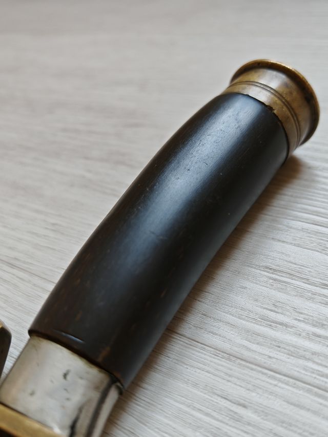Dettagli del prodottoAntico arnese arabo dei primi anni del novecento. Lam larga e robusta con scanalature ed incisioni. Manico in corno nero o ebano e pomolo in ottone lavorato.