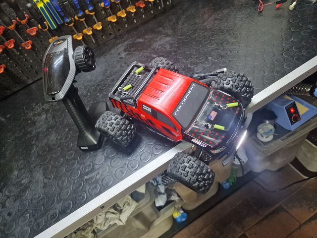 Modellino di auto telecomandata. - Carrozzeria rossa con dettagli neri e stelle. - Ruote grandi tassellate. - Telecomando incluso.