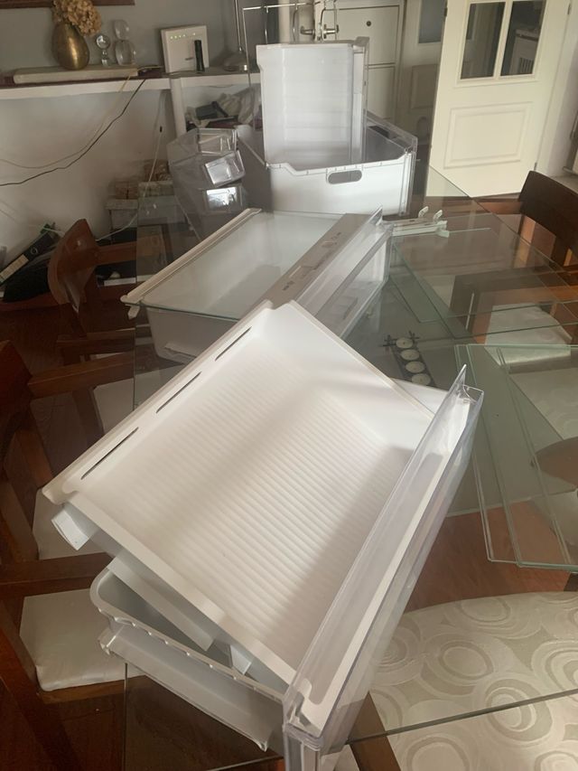 Dettagli del prodottoSet di ripiani e cassetti per frigorifero da 2 metri.Buone condizioni. anche x separato.Tutto 50,00€ separatamente 5,00€