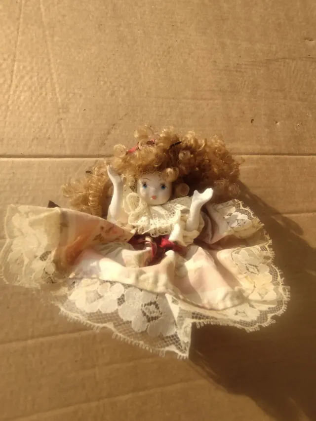 Bambola in porcellana Capodimonte, con dettagli curati e abito elegante. - Materiale: porcellana - Dettagli in pizzo sull'abito - Capelli biondi ricci