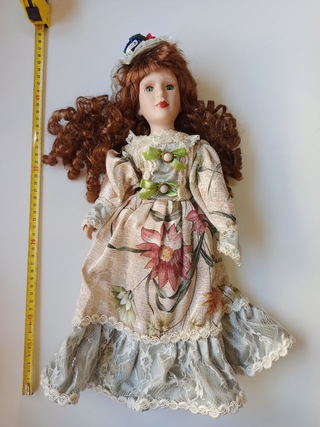 Bambola in ceramica alta 50 cm. Piccolo difetto dietro le scarpine. Nuova, in ottime condizioni.