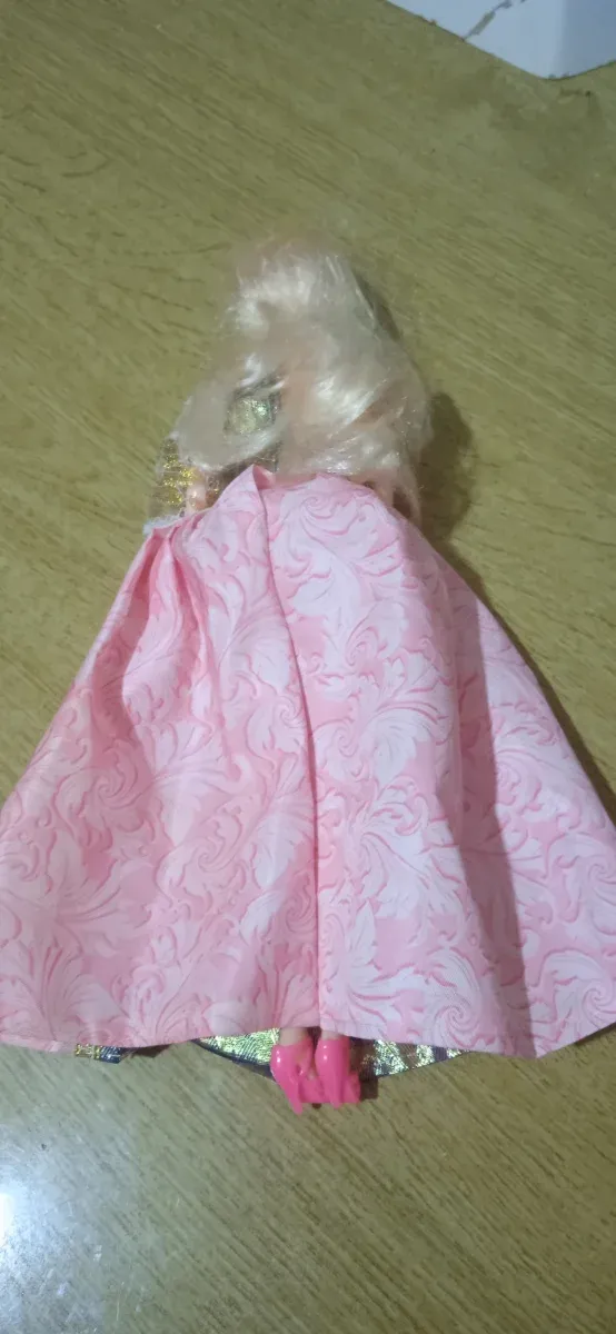 Bambola con un grazioso vestito rosa decorato. - Vestito con fantasia floreale. - Scarpe rosa. - Capelli biondi.