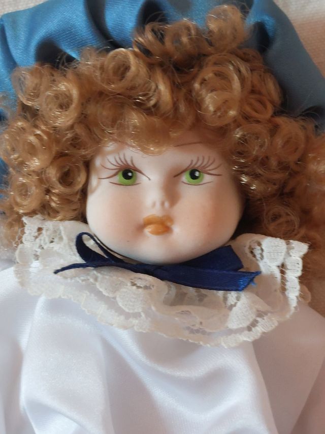 Bellissima bambola di porcellana, con dettagli curati. - Capelli ricci color biondo chiaro - Vestitino bianco con pizzo - Cappellino blu