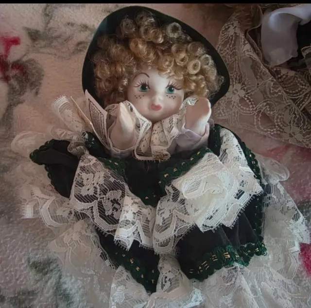 Deliziosa bambola in porcellana con un elaborato vestito. - Dettagli in pizzo bianco. - Abito verde scuro con finiture dorate. - Capelli ricci biondi e occhi azzurri.