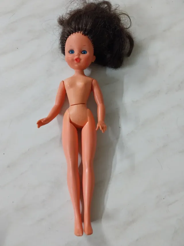Bambola vintage da collezione, perfetta per gli appassionati. - Capelli castani lunghi. - Occhi azzurri. - Labbra rosse. - Corpo in plastica color pesca.