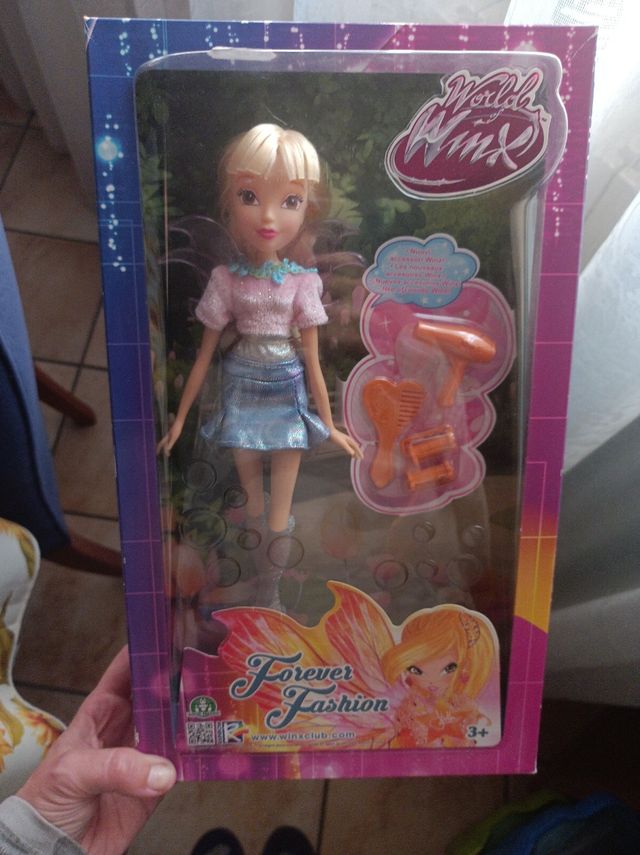 Bambola di Stella dal mondo di Winx, linea Forever Fashion. Include accessori per capelli. - Bambola di Stella - Accessori per capelli (phon, spazzola, bigodini) - Età consigliata: 3+