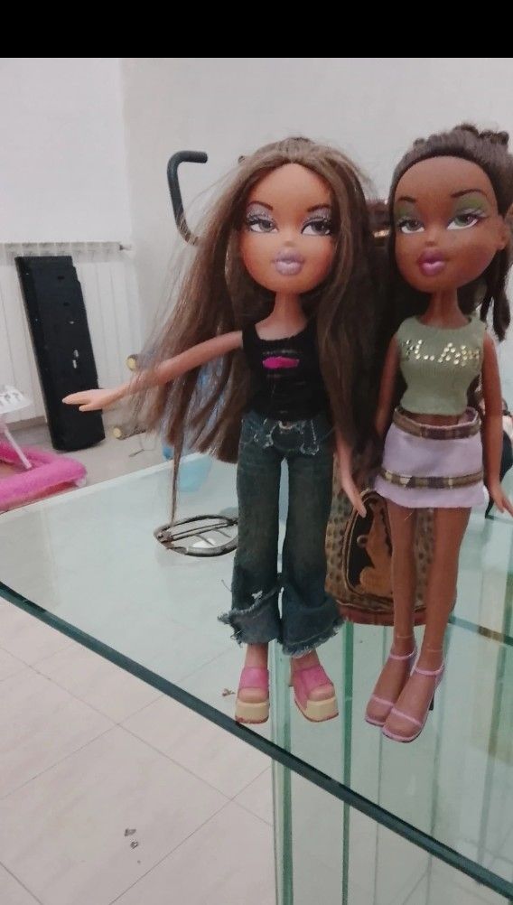 Due bambole Bratz originali in stile vintage. - Capelli lunghi e castani. - Vestiti alla moda. - Scarpe con plateau e sandali con tacco.