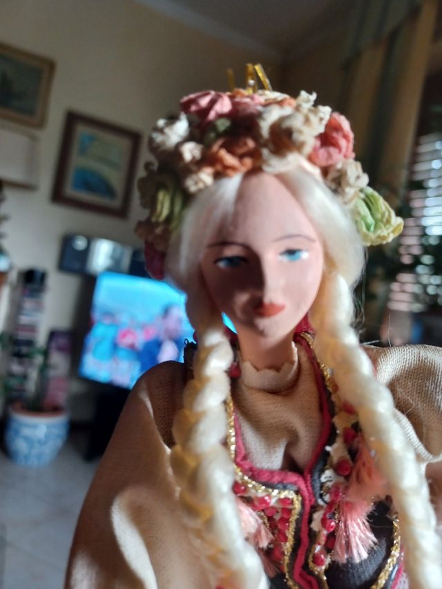 Bambolina del 1987, perfetta, su piedistallo, vestiti tradizionali