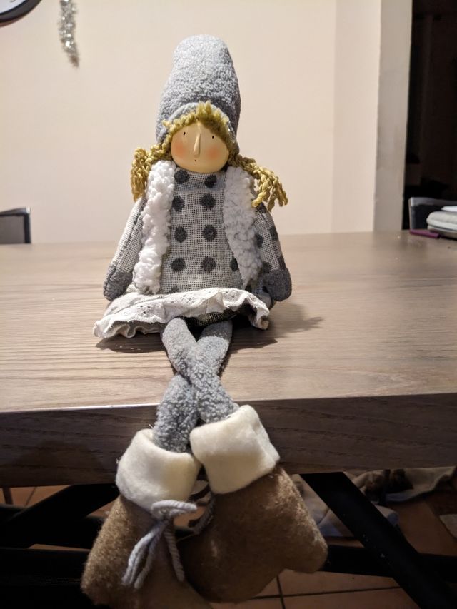 bellissima e simpaticissima bambolina soprammobile da scaffale: lunghezza 39 cm., seduta misura 17 cm