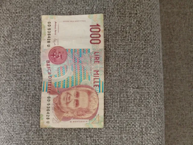 Banconota da 1000 Lire della Banca d'Italia. - Serie GD 536428 U. - Ritratto di M. Montessori.