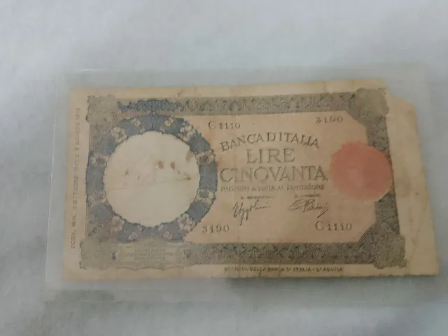 Banconota d'epoca da 50 Lire emessa dalla Banca d'Italia. - Valore: Cinquanta Lire. - Data: Ottobre 1943. - Stampata a L'Aquila.