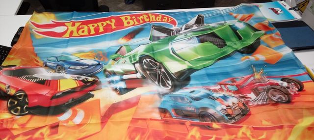 Bandierine scacchiera bianche e nere tagliate a pezzi (mt totali 15) + striscione per festa a tema Hot Wheels