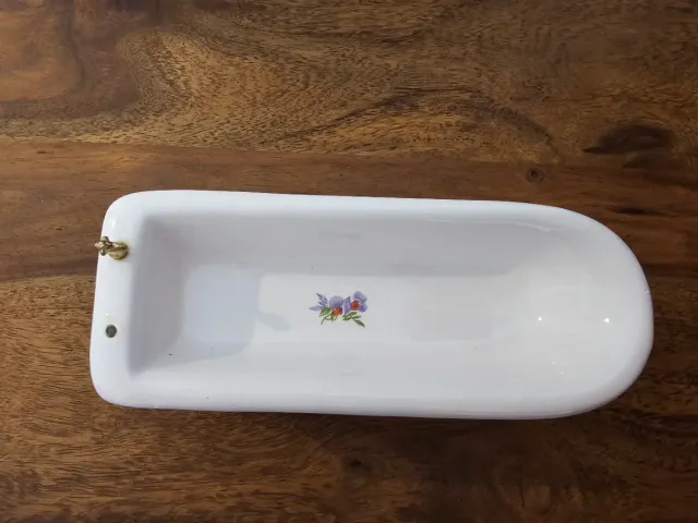 Dettagli del prodottoMiniatura di vasca in porcellana, ideale per case delle bambole o collezionismo. Design classico di vasca. Piccolo dettaglio floreale dipinto all'interno. Rubinetto e scarico decorativi. Manca un rubinetto staccato, che può essere incollato. La descrizione è stata tradotta automaticamente.