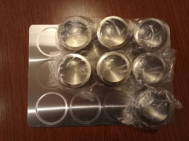 Dettagli del prodotto12 Barattoli magnetici in acciaio inox con base. Etichette adesive per scrivere nome spezie con pennarello bianco in dotazione.