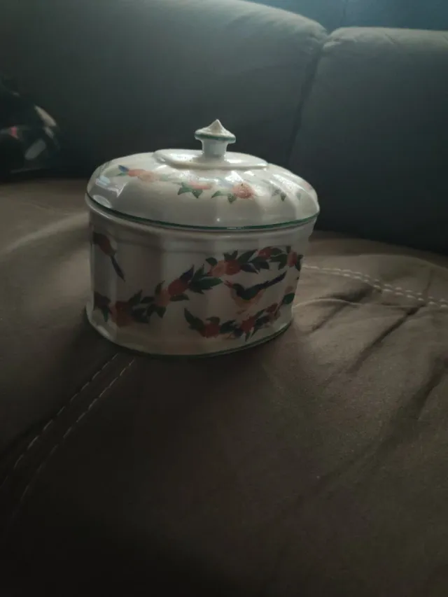 Dettagli del prodottoElegante barattolo in porcellana decorato con un motivo di uccelli e fiori.