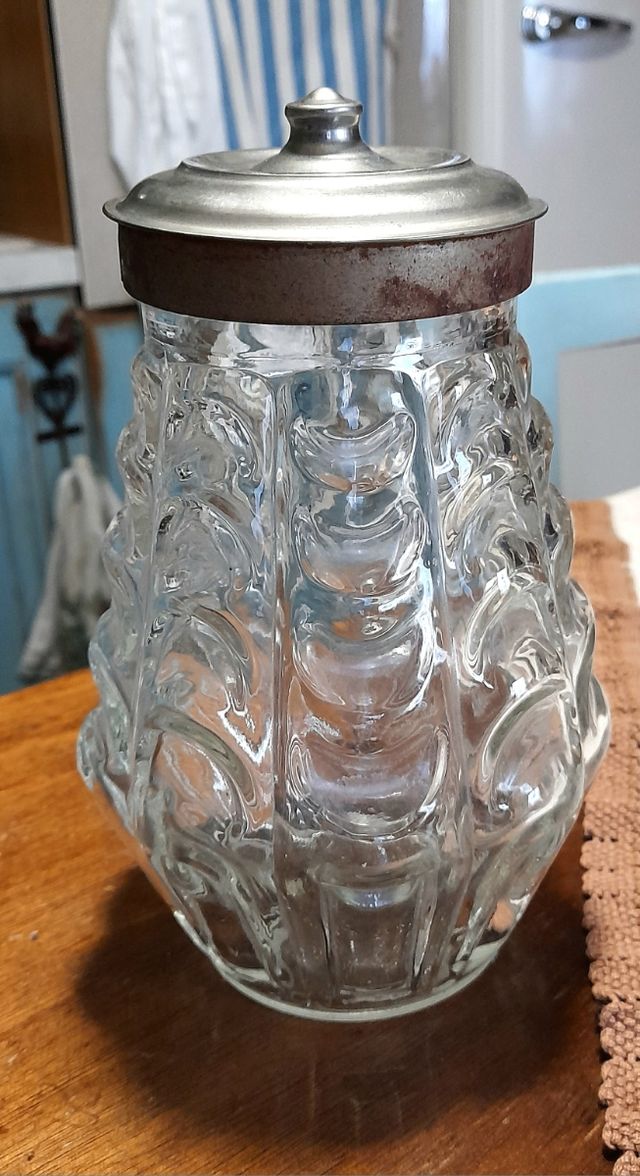 Barattolo vintage in vetro lavorato con coperchio in metallo, altezza 20 cm circa.