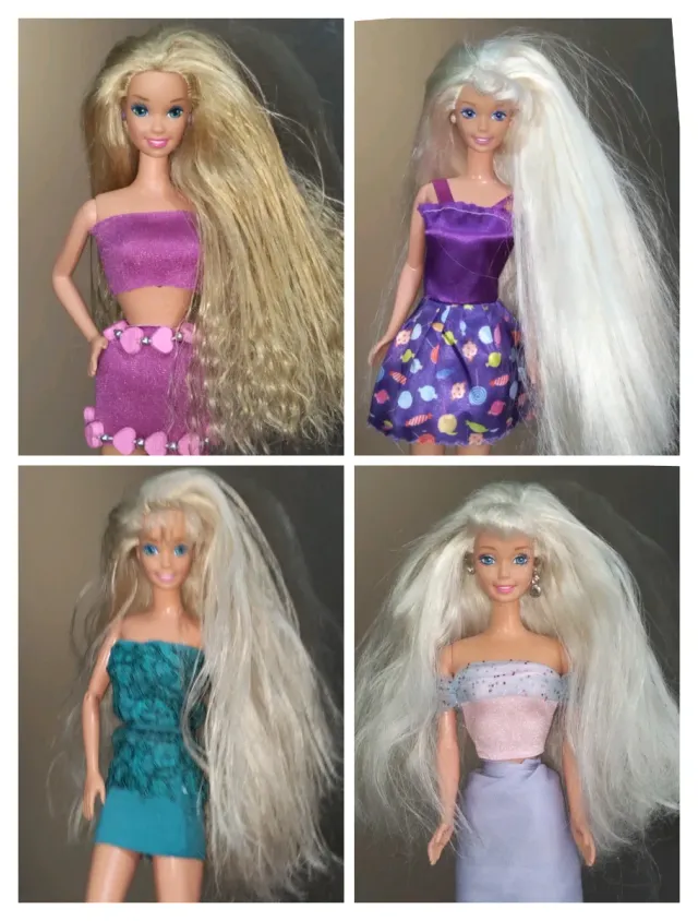 Dettagli del prodottoLotto di bambole Barbie con capelli lunghi e folti.