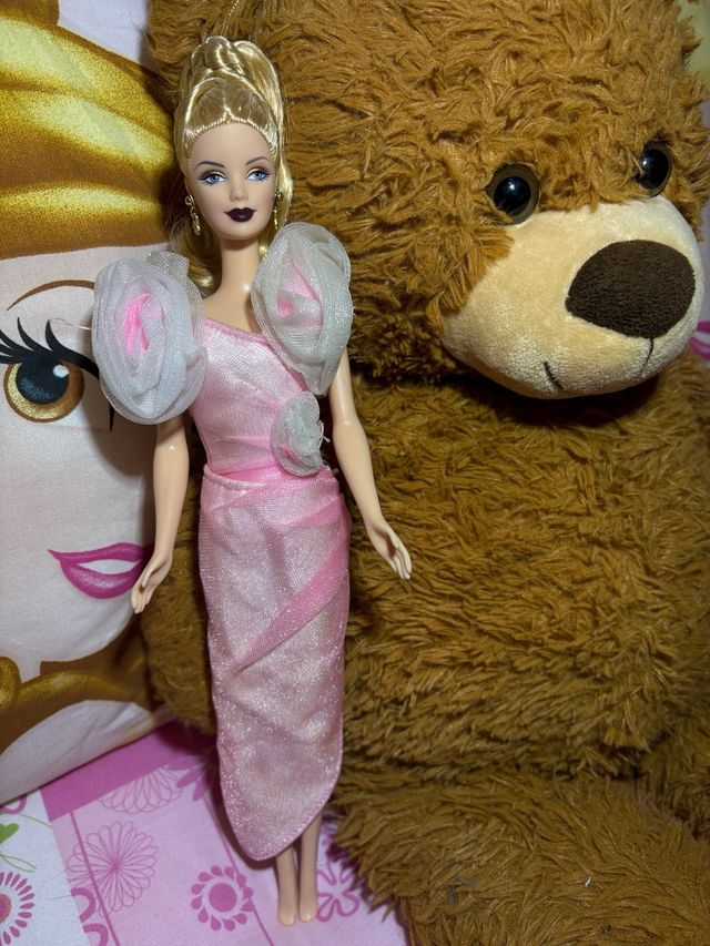 Bambola Barbie con un elegante abito rosa. - Dettagli floreali sulle spalle. - Tessuto scintillante per l'abito. - Capelli biondi raccolti.