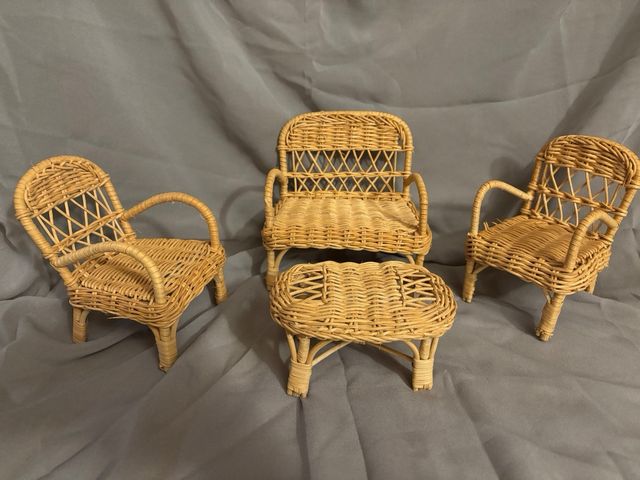 Salottino in vimini anni 90. Composto da: divano, 2 poltrone e tavolino. Adatto per Barbie e bamboline