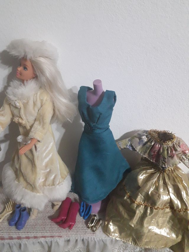 Barbie con cappotto cappello stivali + 2 abiti e accessori come in foto senza manichino