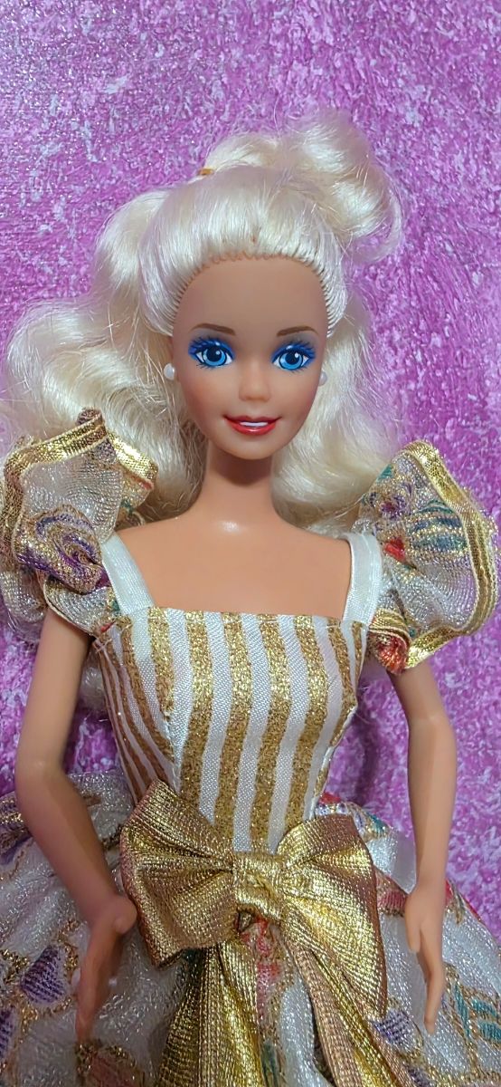 Dettagli del prodottoBambola Barbie con un elegante vestito a righe dorate e bianche.