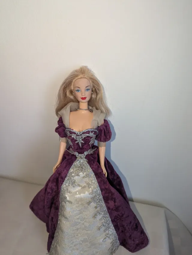 - Vestito in velluto viola con dettagli argentati. - Gonna ampia con inserto centrale decorato. - Maniche a sbuffo e scollo ampio.