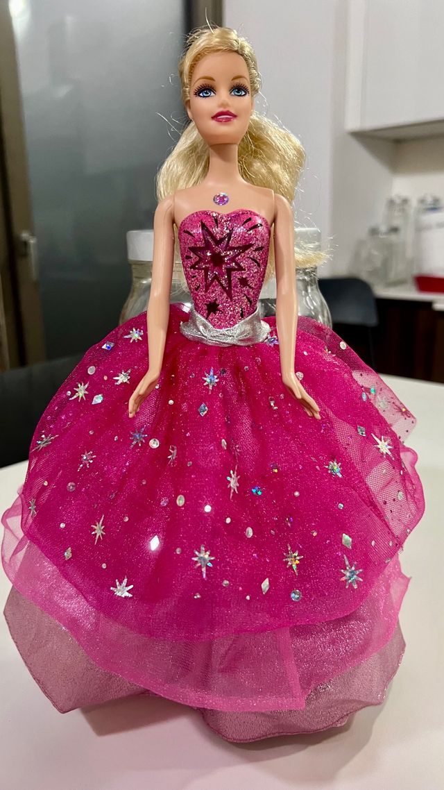 - Vestito rosa scintillante con dettagli a stella.