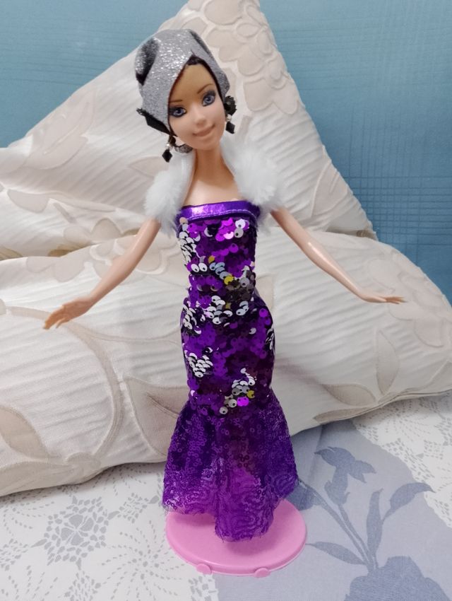 Dettagli del prodottoBambola Barbie, edizione Indonesia del 1999. Indossa un abito viola scintillante con paillettes e un copricapo argentato.