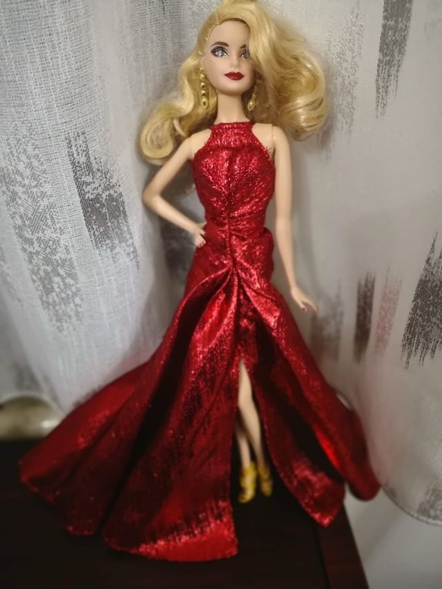 Bambola Barbie Magia delle Feste del 2017, con un elegante abito rosso scintillante. - Abito lungo con spacco. - Dettagli scintillanti. - Gioielli dorati.