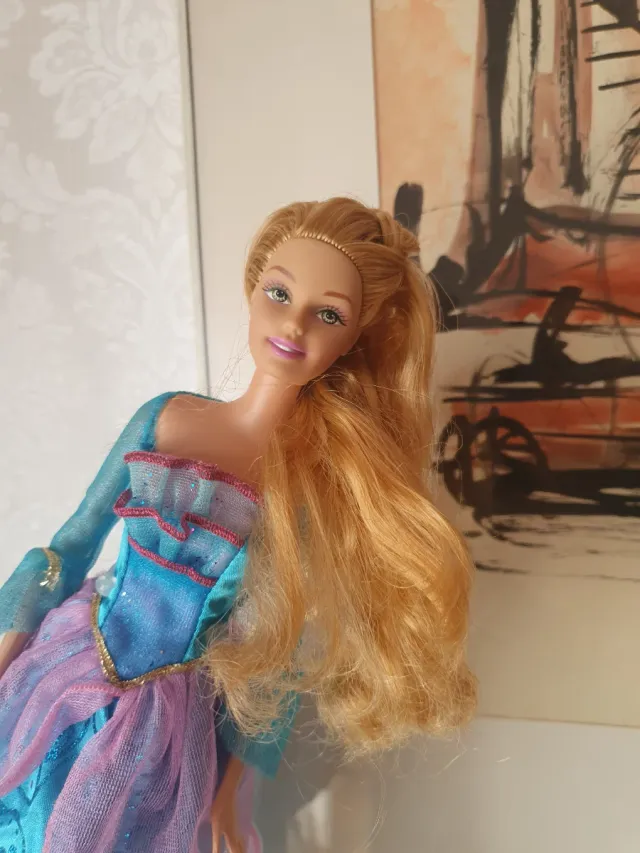 Bambola Barbie con capelli biondi e vestito azzurro e rosa. - Vestito con dettagli glitterati con difetti come in foto