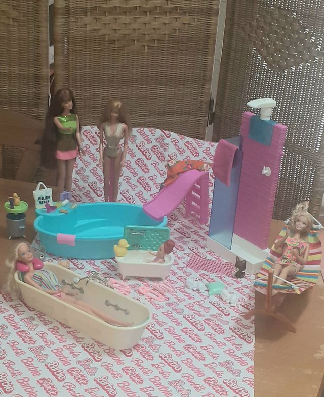 4 bellissime Barbie con set piscina e bagno idromassaggio con tutti gli accessori in foto