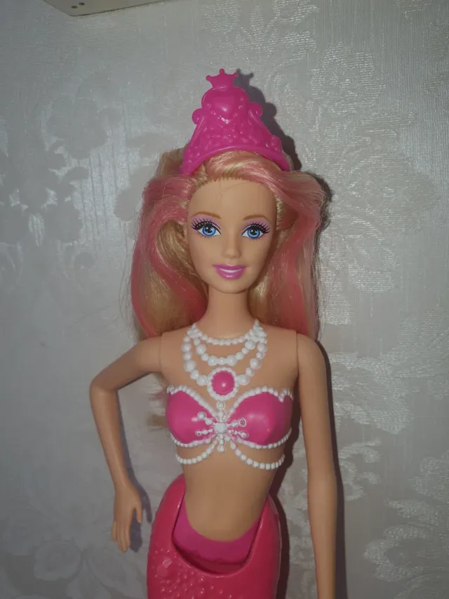 Bambola Barbie sirena con corona e collana. Segni di usura nel viso