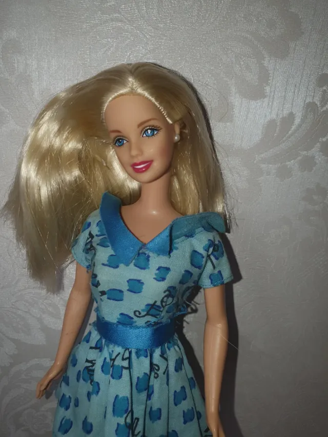 Bambola Barbie con un grazioso vestito azzurro a fantasia. - Vestito con stampa floreale blu. - Cintura in raso azzurro. - Colletto a contrasto.